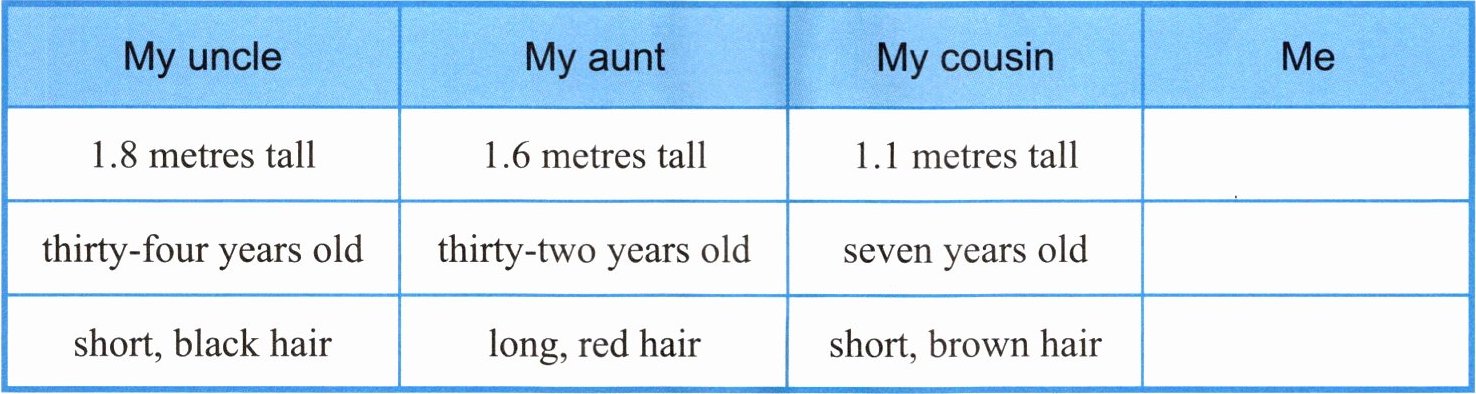 My aunt is 1.6 metres tall. She is thirty-two years old. She has long, red hair. My cousin is 1.1 metres tall. He is seven years old. He has short, brown hair.