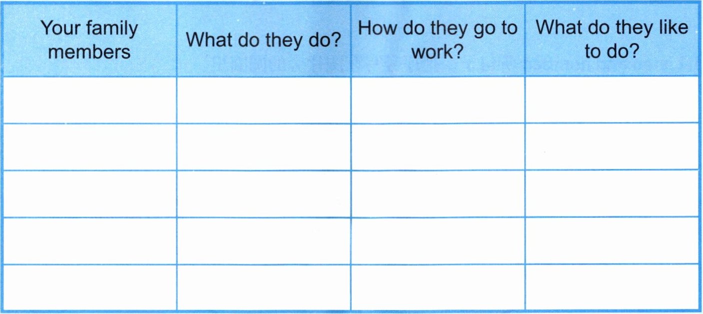 | Your family members | What do they do? | How do they go to work? | What do they like to do? |