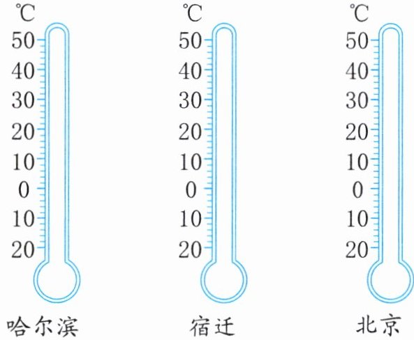 (1) 把这三个城市该天的最高气温在温度计上表示出来。