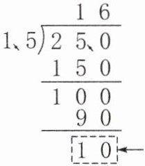 2. 李叔叔打包一个纸箱需要长$1.5$米的胶带,一卷长$25$米的胶带最多能打包多少个?如图,用竖式计算能打包的纸箱个数,箭头所指的“$10$”表示(