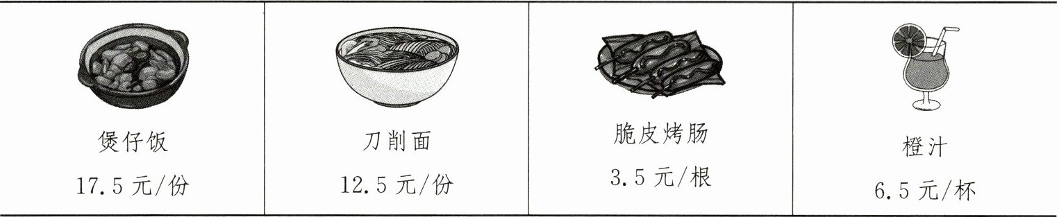 (1)笑笑的妈妈点了 $2$ 份煲仔饭,$2$ 份刀削面和 $4$ 根脆皮烤肠,买这些要花多少元?(4 分)