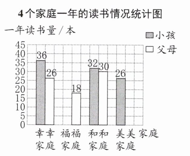 (2)这4个家庭中,小孩一年的平均读书量是( )本,父母一年的平均读书量是( )本。