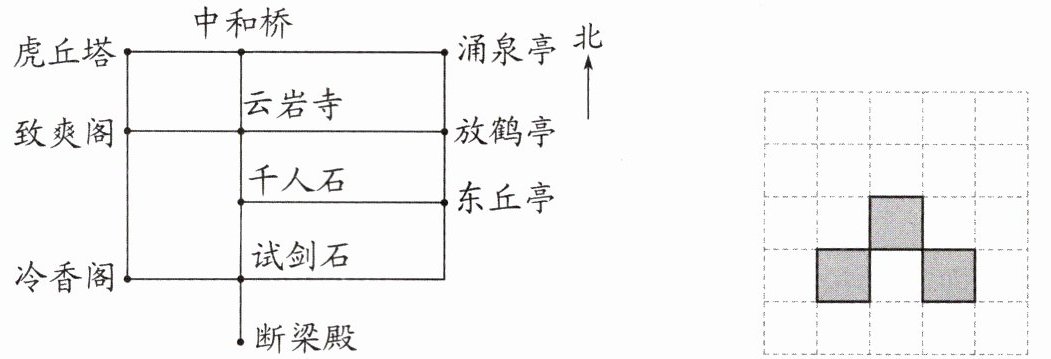 2. 新情境 地域景观 虎丘山素有“吴中第一名胜”的美誉。森森一家在暑假期间到虎丘山游玩,他们准备从冷香阁出发,目的地是涌泉亭,沿途的主要景点如左下图所示。若只允许向北或向东走,不能走重复路线,那么从断梁殿到涌泉亭一共有(