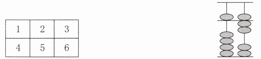 5. 新情境 传统文化 我国传统珠算早就被列人人类非物质文化遗产名录。在算盘上,一颗上珠表示5,一颗下珠表示1,右上图就表示57。如果在算盘上用两颗珠表示一个两位数,那么可以表示出(