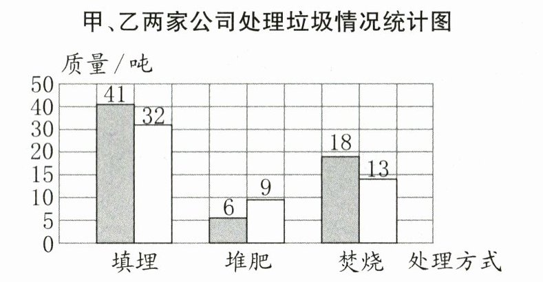 2. 新情境 环保意识 垃圾处理可以有效减少环境污染,有助于资源的循环利用。下面是两家垃圾处理公司一天处理垃圾的情况统计表。华华根据表中的数据绘制了一幅复式条形统计图,统计图中存在的问题有(