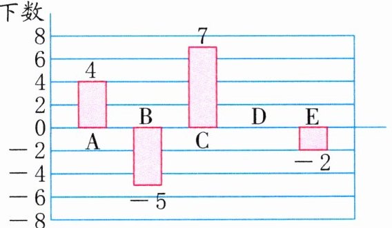 4. 以 A、B、C、D、E 五名同学 1 分钟跳绳的平均数量为基准,记作 0 下。丽丽已经用如图所示的条形图表示了其中四名同学 1 分钟跳绳的下数。