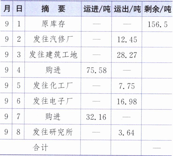 |月|日|摘要|运进/吨|运出/吨|剩余/吨|