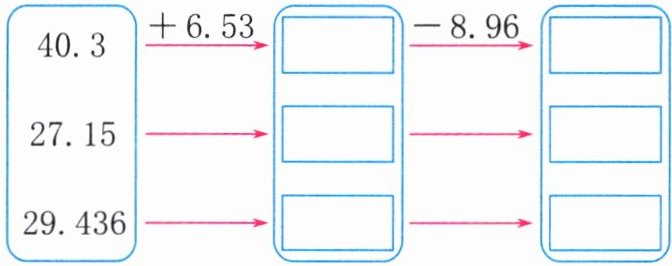$\begin{array}{l}40.3\\27.15\\29.436\end{array} \xrightarrow{+6.53}\begin{array}{l}□\\□\\□\end{array}\begin{array}{l}□\\□\\□ \xrightarrow{-8.96}\begin{array}{l}□\\□\\□\end{array}\begin{array}{l}□\\□\\□ $