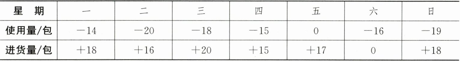 3. 新素养应用意识 麦麦面包店一周内每天面粉的使用量和进货量如下表所示,其中某一天面包店因为店员集体参加公益活动暂停营业一天,只留下了个别员工处理进货工作。