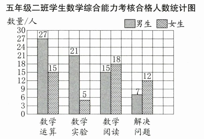 6. 五年级二班进行数学综合能力考核,从数学运算、数学实验、数学阅读、解决问题四个项目对45名学生分别进行了考核,各项目合格人数统计如下。