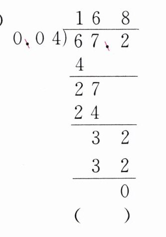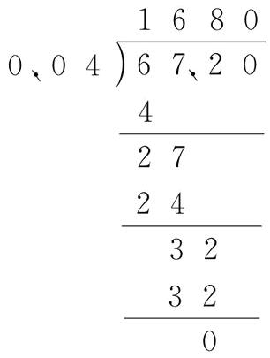 $\begin{array}{r}168 \\0.04\enclose{longdiv}{67.2} \\4 \\\hline27 \\24 \\\hline32 \\32 \\\hline0\end{array} $