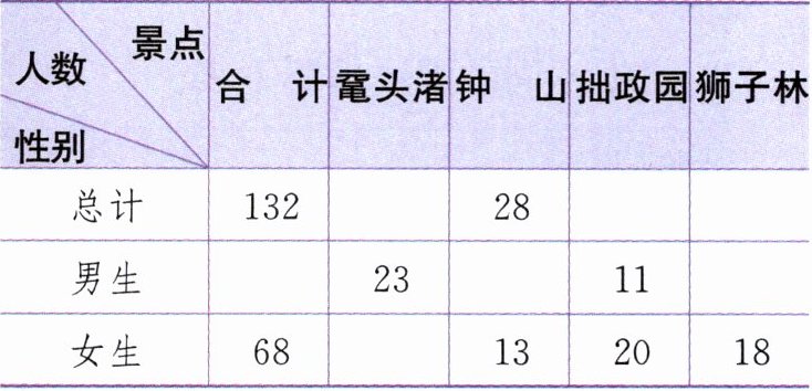 (2)28 解析:同时喜欢拙政园和鼋头渚的女生最多有17人,男生最多有11人,一共有17+11=28(人)。