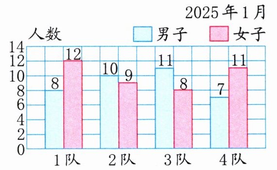 6. 蕉城区某社区组织拔河比赛,下面是四支参赛队伍现有男子、女子队员人数统计图。若又有8名男子和8名女子报名参赛,怎样分配这些新加入的参赛者比较合理?