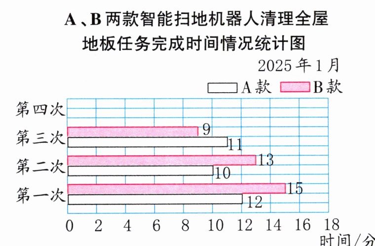 4. A、B两款智能扫地机器人4次平均任务完成时间都是11分钟,把统计图补充完整。