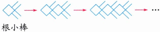 (1) (苏州真题)如图,当摆成$5$条鱼连在一起时,一共需要( )根小棒;当摆成$n$条鱼连在一起时,一共需要( )根小棒。