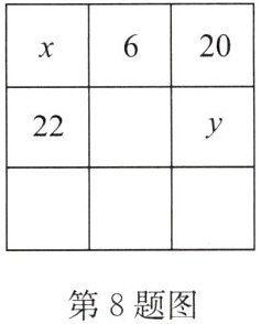 8. 如图是一个未完成的幻方(每一行、每一列以及两条斜对角线上的数字之和都相等),则 $ x $ 与 $ y $ 的和是