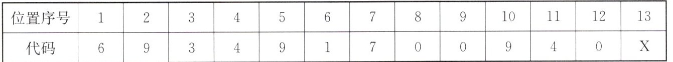 .(1)解:步骤1:自左向右编号.位置序号12345678910111213 代码 692015246102Y 步骤2:求前12位数字中偶数位上的数字之和s.s=9+0+5+4+1+2=21.步骤3:求前12位数字中奇数位上的数字之和t.t=6+2+1+2+6+0=17.步骤4:求3s与t的和m.m=3s+t=3×21+17=80.步骤5:取不小于m且为10的整数倍的最小值n.n=80.步骤6:求n与m的差就是校验码Y.Y=n−m=0,即校验码Y的值为0.