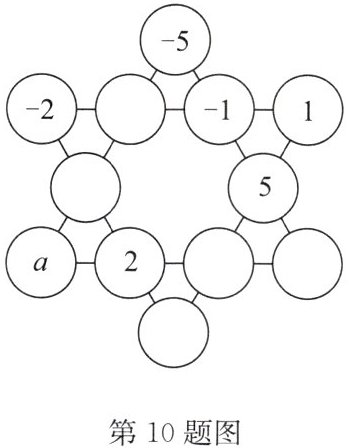 10. 如图,在探究“幻方”“幻圆”的活动课上,学生们感悟到我国传统数学文化的魅力. 一个小组尝试将 $ - 5 $,$ - 4 $,$ - 3 $,$ - 2 $,$ - 1 $,0,1,2,3,4,5,6 这 12 个数填入“六角幻星”图中,使 6 条边上四个数之和都相等. 部分数字已填入圆圈中,则 $ a $ 的值为