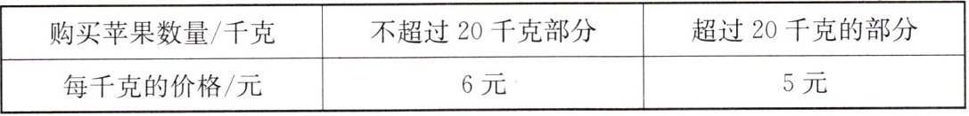 (2)解:设第一次购买x千克苹果,则第二次购买(40-x)千克苹果,根据题意,得6x+6×20+5(40-x-20)=230,解得x=10,所以40-x=30.答:第一次购买10千克苹果,第二次购买30千克苹果.