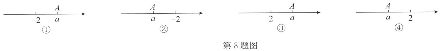 8. 如图,四个数轴上的点 A 都表示数 a,其中一定满足$|a| > 2$的是(