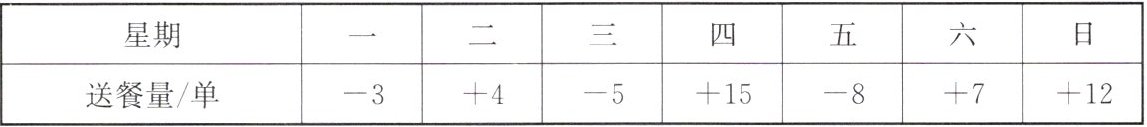 (2)$50×7+[(-3)+(+4)+(-5)+(+15)+(-8)+(+7)+(+12)]=350+22=372$(单),$372×4=1488$(元).答:外卖小哥这一周的收入为1488元.