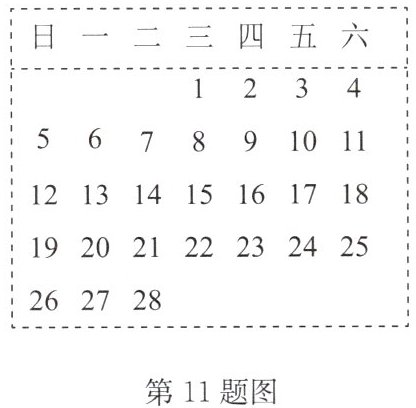 11. 如图是某月的月历,现用一个长方形在月历中任意框出$4个数\begin{array}{cc}a&b\\c&d\end{array} $,用等式表示$a$,$b$,$c$,$d$之间的关系为