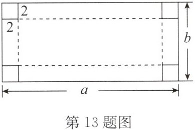 13. 如图是一个长、宽分别为$a$,$b$的长方形铁片,在铁片的四个角各剪掉一个边长为$2的小正方形(4 < b < a)$,然后做成一个无盖的长方体盒子,用含字母$a$,$b$的式子表示出盒子的底面积和体积.