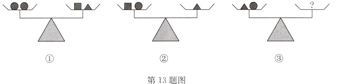 13.(2024·海州区期末)如图,用“●”“▲”及“■”代表$3$种不同物体,且前两个天平是平衡状态,现需在第③个天平的“?”处放置
