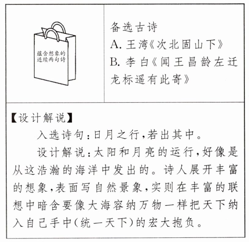 5. 同学们正在设计以古诗词为主题的手绘帆布袋,请你从下面的“备选古诗”中选择一首,仿照【设计解说】,完成设计。