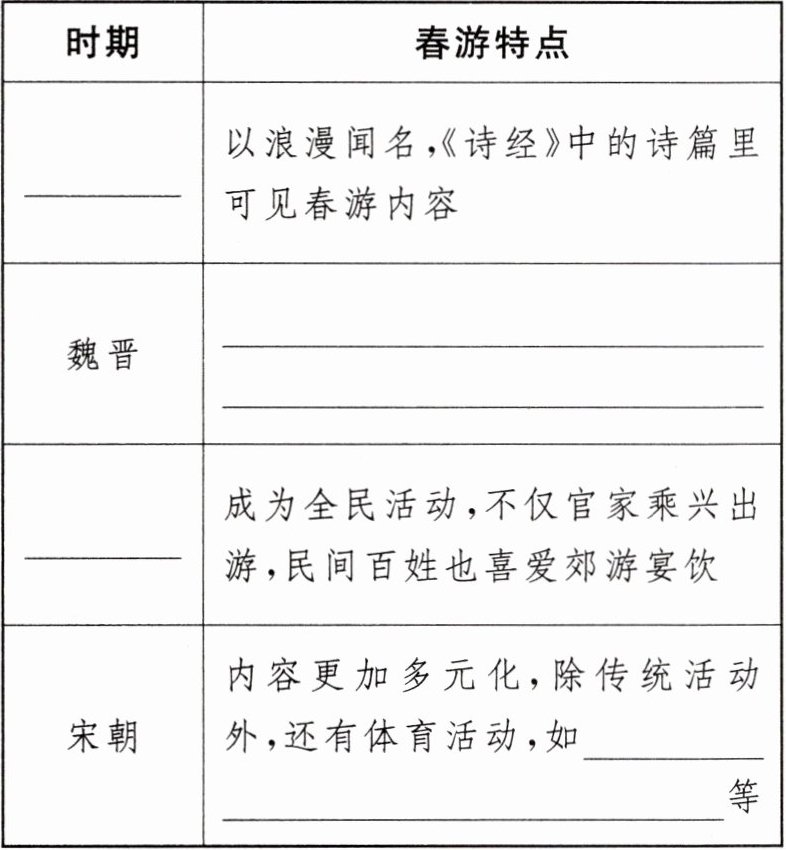 2. 春游踏青,浪漫惬意。为了帮助大家了解春游的历史文化,小语利用DeepSeek搜集了古人春游踏青的相关资料,请你根据提示,将时间轴上的空缺信息补充完整。