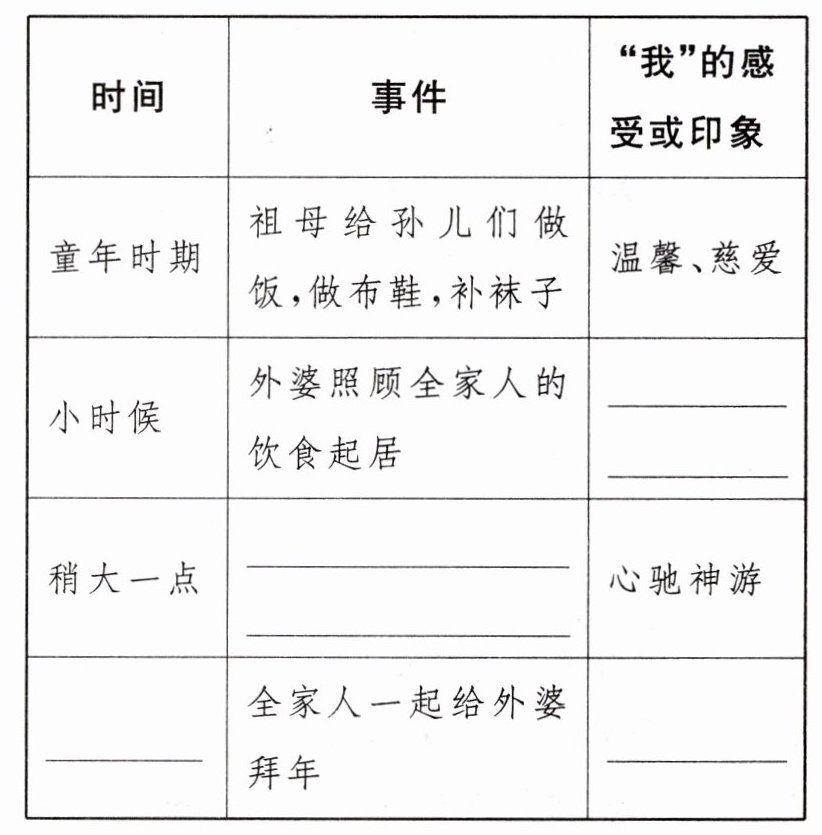 6. 文章按照时间顺序记叙了“我”与祖母、外婆之间的几件事,让人读后倍感温馨。请你阅读全文,结合文章内容补全下面的表格。