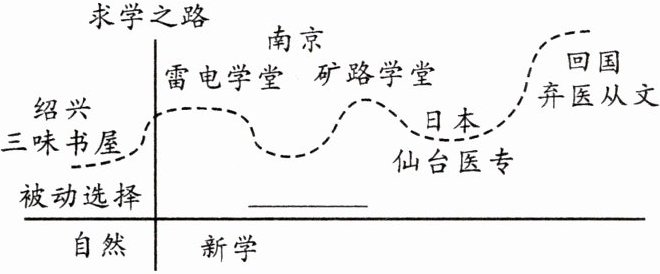 1. 小文在阅读《朝花夕拾》时,发现可以通过鲁迅先生的“求学之路”,探索他的心路历程,于是绘制了下面的思维导图。请你从“选择”的角度先将图中横线处补充完整,然后从“变”的角度来阐释你对鲁迅先生“选择”的理解。
