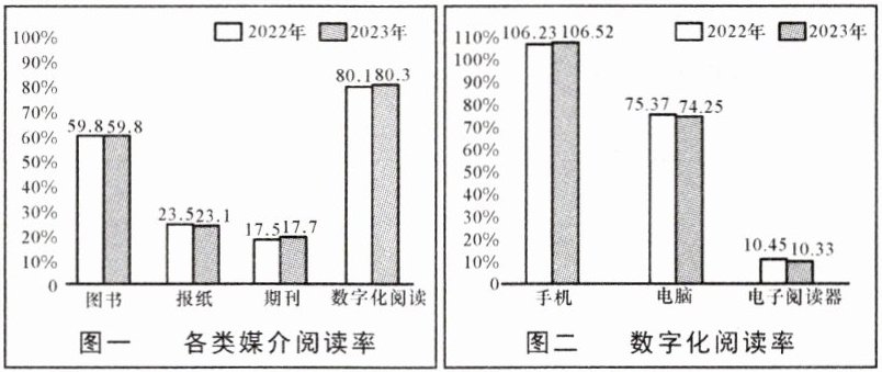 2. 2024 年 4 月 23 日,在第三届全民阅读大会上,中国新闻出版研究院发布了第二十一次全国国民阅读调查结果。请你观察下面两组统计图,完成题目。