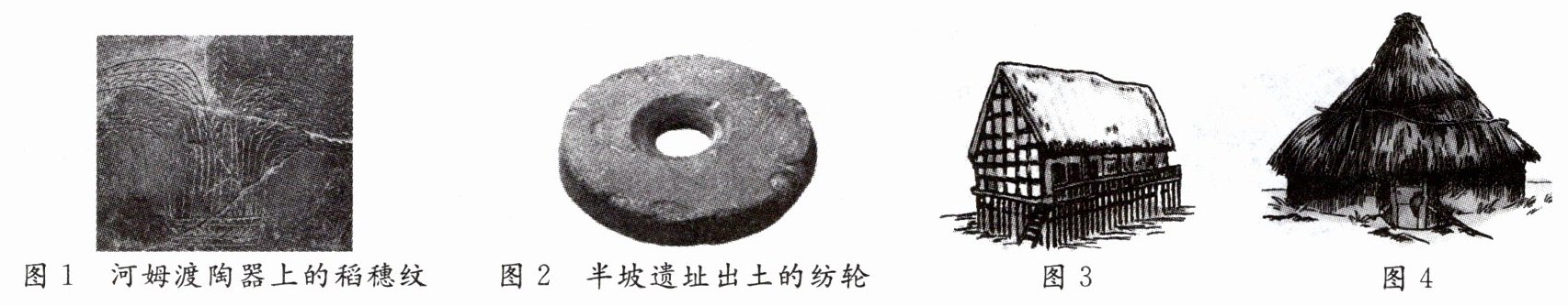 (2)材料二中的四幅图片和哪些原始居民的农耕生活相关?(2分)结合所学知识,对图1和图2所蕴含的历史信息进行解读。(2分)据图3、图4,分析两种房屋存在差异的原因是什么。(1分)