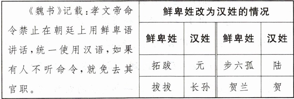 (2)改革:北魏孝文帝改革。(2分)主要措施:①使用汉语;②改鲜卑姓为汉姓。(每点1分,共2分)