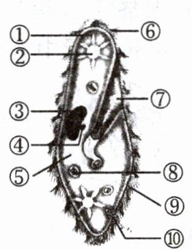 ①收集管 ②伸缩泡 ③大核 ④小核 ⑤细胞质 ⑥纤毛 ⑦口沟 ⑧食物泡 ⑨表膜 ⑩胞肛 获得氧气 多余的水分和代谢产生的废物 摆动 旋转 食物残渣 细胞分裂