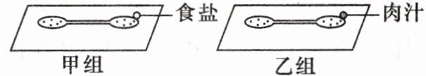 6. (2023·南充)某同学为探究草履虫的应激性,做了以下实验:在甲、乙两组载玻片上各滴加一滴草履虫培养液,然后在甲组载玻片一侧放一小粒食盐,在乙组载玻片一侧滴加一滴肉汁,如图所示。下列叙述错误的是 (