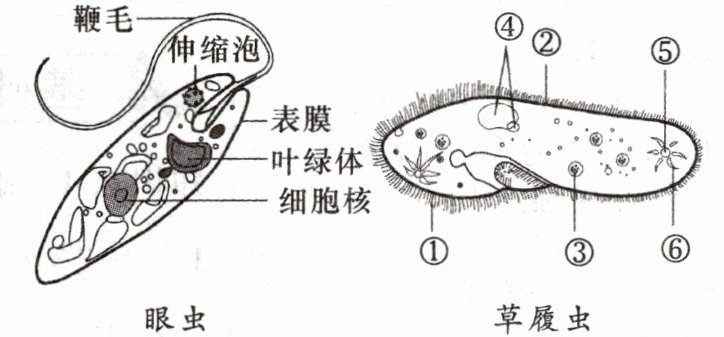 12. 某中学课外兴趣小组的同学取池塘中的水在显微镜下观察,发现了两种微小生物:眼虫和草履虫。其结构示意图如图所示。