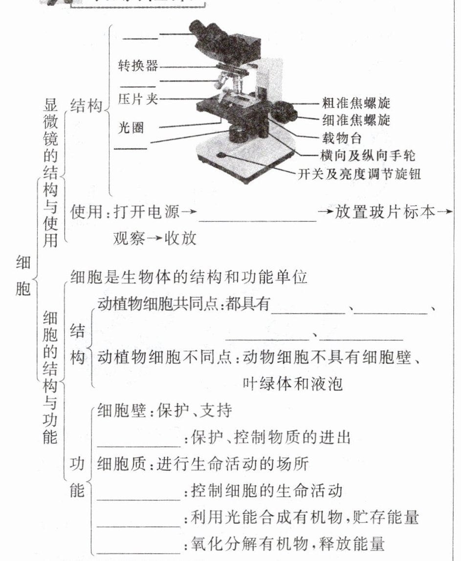 目镜 物镜 光源 调试显微镜 细胞膜 细胞质 细胞核 线粒体 细胞膜 细胞核 叶绿体 线粒体