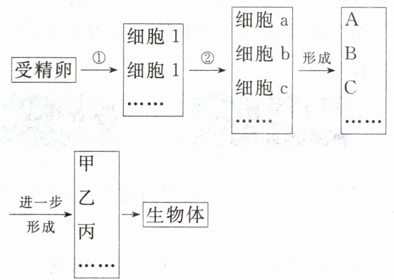 11. 科学思维综合无论植物、动物和人体都是富有层次的生命体。如图是西西绘制的绿色开花植物和人体结构层次共同部分的示意图。图中,①和②表示细胞生理活动;细胞1、细胞a、细胞b、细胞c……表示不同类型的细胞;A、B、C……表示不同类型的组织;甲、乙、丙……表示不同类型的器官。请据图回答问题。