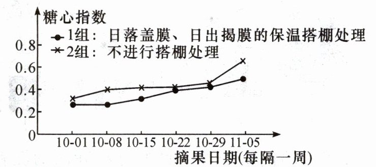 4. 科学思维分析(2023·陕西)小秦知道了新疆哈密瓜甜的原因后,想探究夜间温度对苹果含糖量(“糖心指数”越高,含糖量越高)的影响,于是在家人的帮助下,选取同一果园长势相近的果树,分两组进行探究。如图可得出的结论是 (