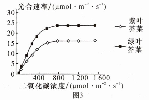 11. (2024·泰安)紫叶芥菜是一种富含花青素的新型保健蔬菜,花青素呈紫色。紫叶芥菜的花青素含量显著高于绿叶芥菜,但二者叶绿素含量无明显差异。研究人员探究光照强度和二氧化碳浓度对紫叶芥菜和绿叶芥菜光合速率的影响,实验结果如图2、图3所示。请分析回答问题。