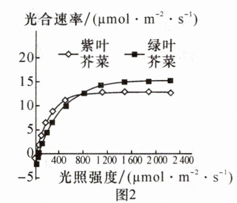 中。(2)分析图2中光照强度低于800μmol·m⁻²·s⁻¹时紫叶芥菜和绿叶芥菜光合速率的变化特点,推测紫叶芥菜在弱光环境中的适应能力