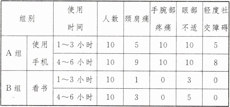 13. 目前社会上“低头族”现象十分普遍,长时间使用手机会对身体产生危害吗?有学生做了这样的实验:选取七年级某班20位学生(10男10女,身体健康状况相同),分为A、B两组,每组男生、女生各5位(共10位学生)。在相同的环境中,给A组每人一部手机,让其随意玩手机游戏;给B组每人一本书,让其随意阅读,其他条件相同。6个小时后获得实验数据如下表。回答下列问题。