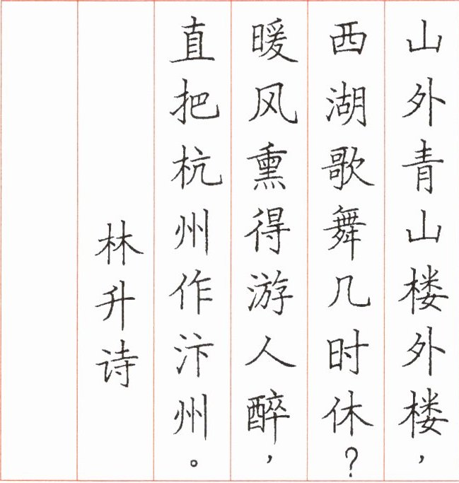 | | | 直把杭州作汴州。 | 暖风熏得游人醉, | 西湖歌舞几时休? | 山外青山楼外楼, | 题临安邸 | |