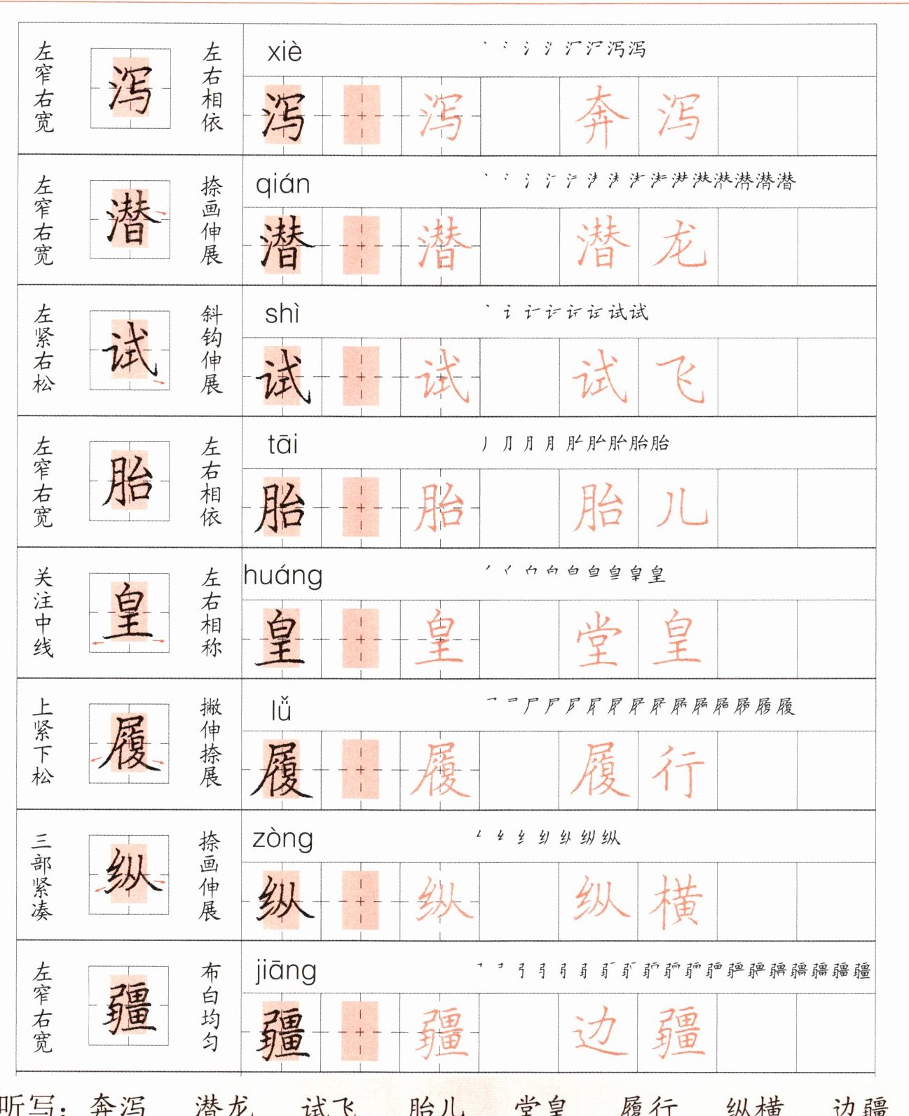 【解析】:本题主要考查汉字的读音、笔画顺序以及组词能力。根据给出的汉字以及对应的拼音、笔画顺序和组词,需要准确记忆每个汉字的读音,掌握其正确的笔画顺序,并能根据字义组成合适的词语。
