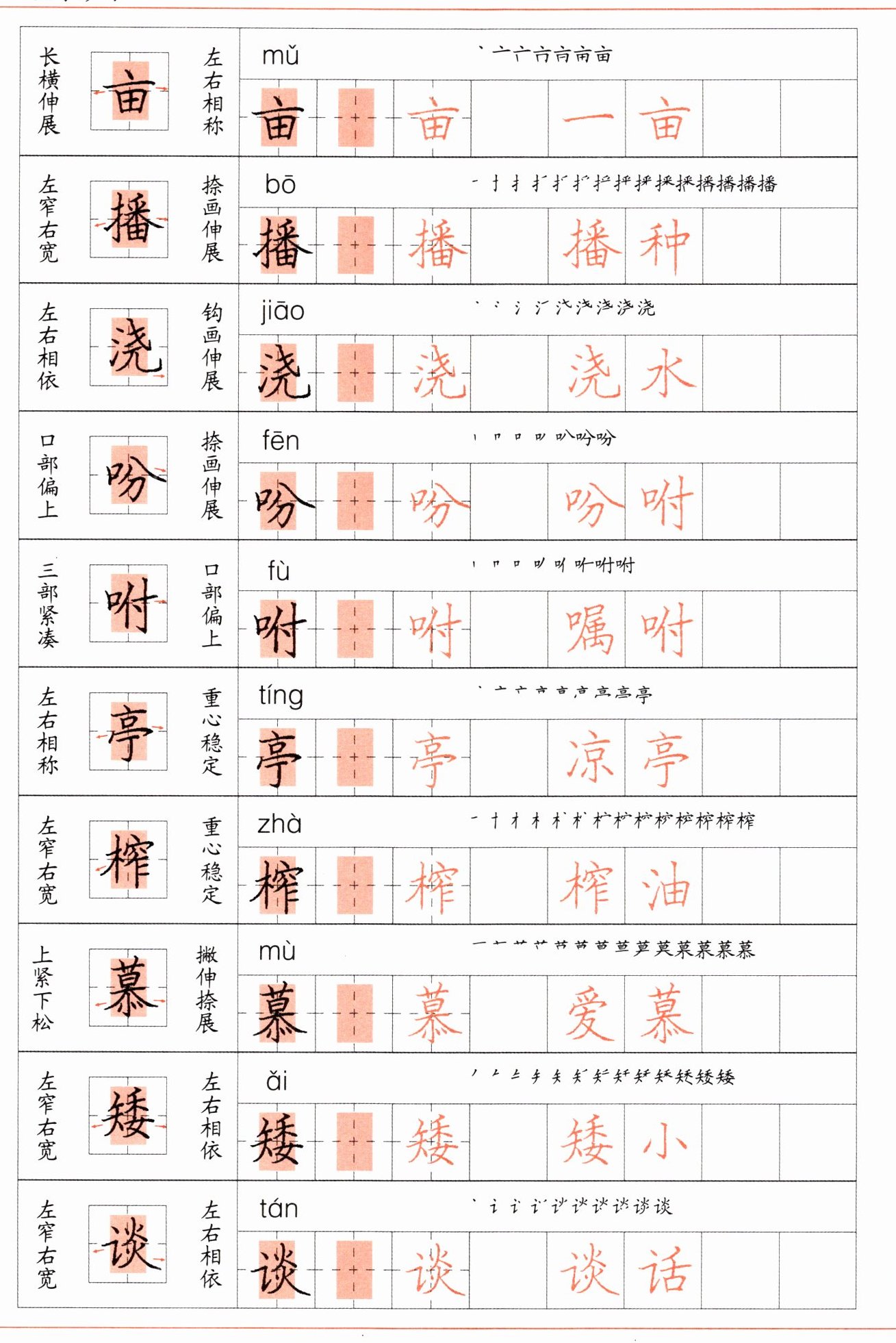 | 结构1 | 例字 | 结构2 | 拼音 | 笔画顺序 | 抄写 | 组词 |