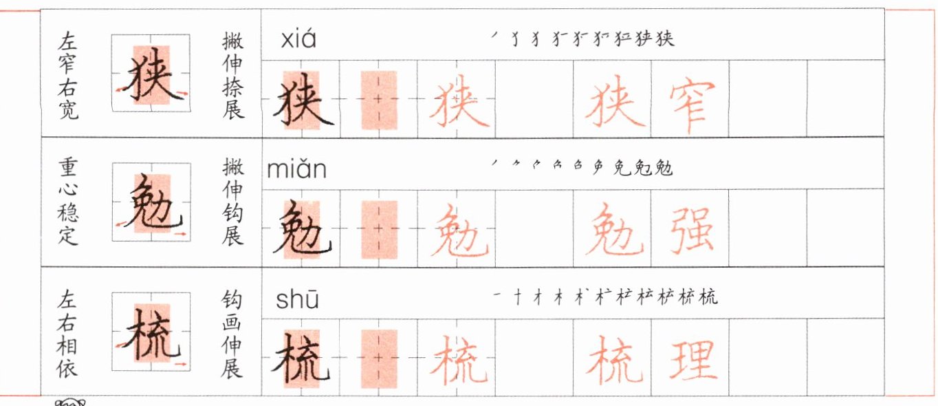 | 左窄右宽 | 狭 | xiá | ’‘犭犭犭狭狭狭 | 狭 狭 | 狭窄 |
