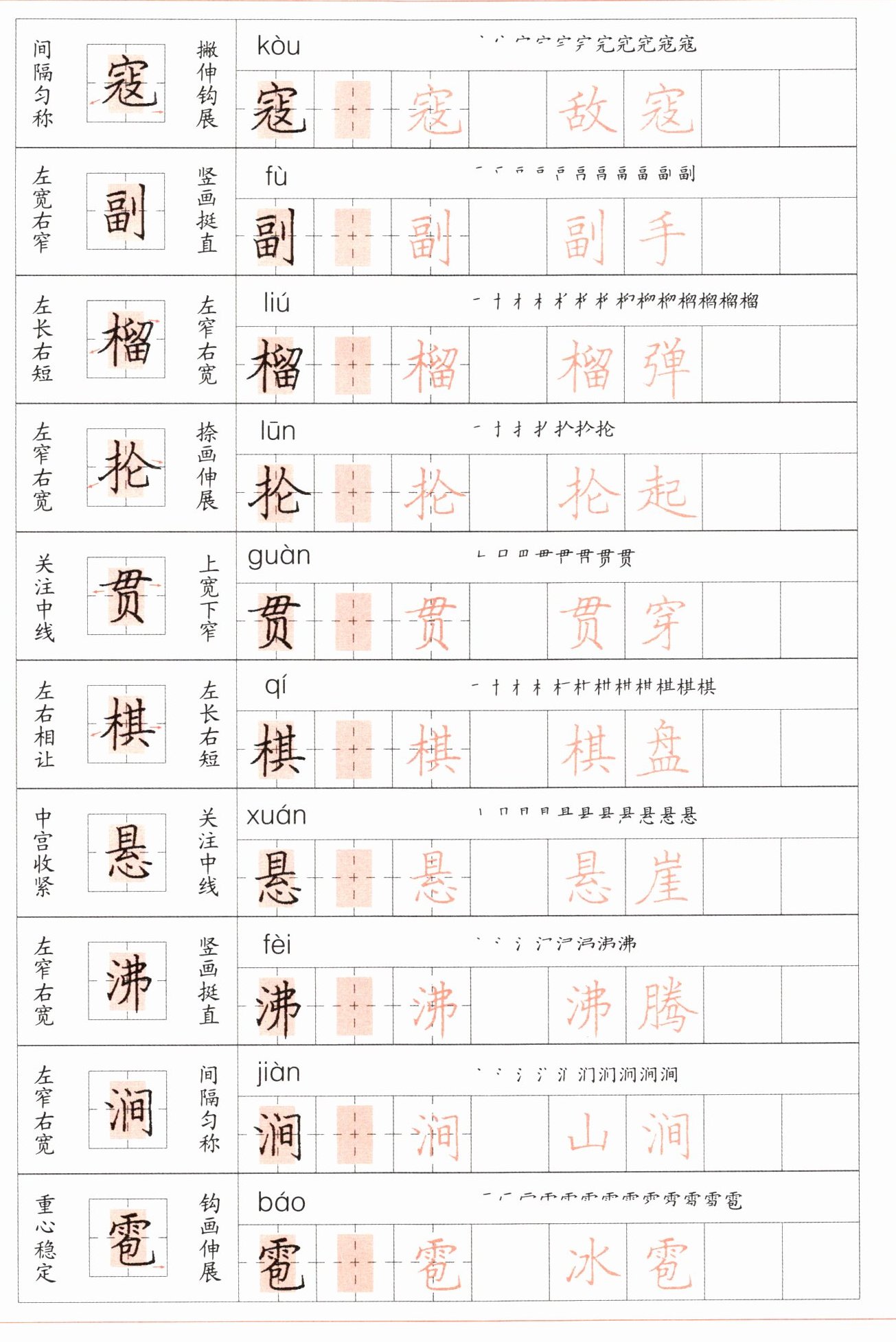 | 间隔匀称 | 寇 | 撇伸钩展 | kòu | 宀穴穴完完完寇寇寇 |