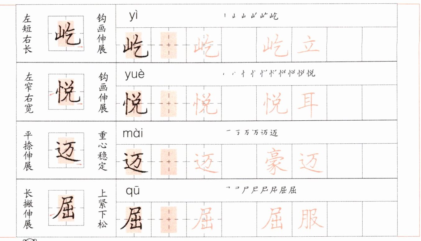 | 结构描述 | 示例字 | 笔画特点 | 拼音 | 笔画顺序 | 抄写内容 |